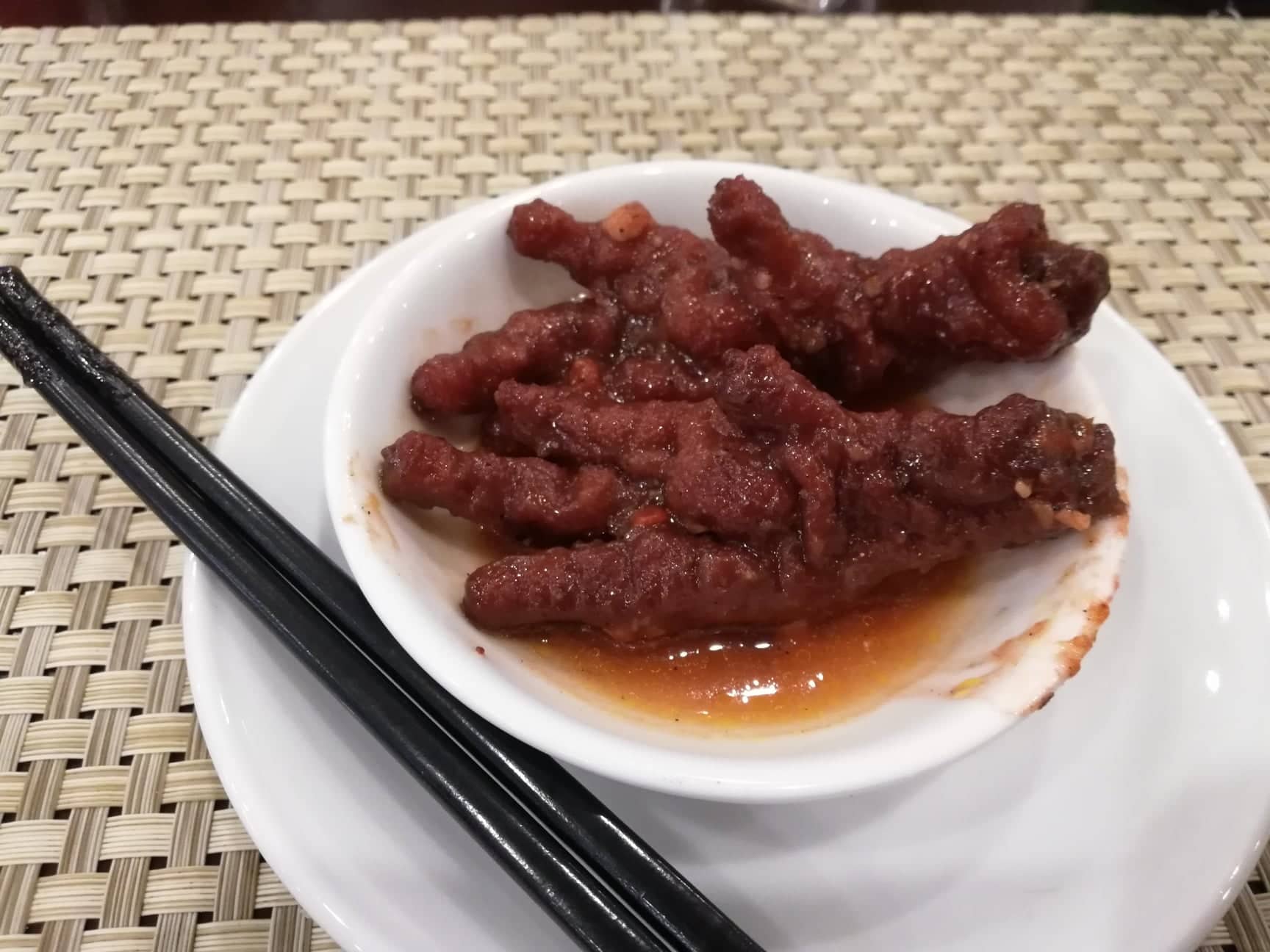 Echt eklig! Aber anscheinend ist sowas dort eine Spezialität. Mein Freund hatte schon angefangen, es zu essen, bevor wir herausfanden was es war: Hühnerfüße!!!